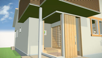 玄関を入ると和室押入れと互い違いにしてシューズクロークが。外回りの品物を収納するのに便利ですね。LDKは20帖の広さになりますがリビング前のデッキにはダイニング側からも出られます。和室も繋げて約26帖の広さ。東西に長いですが変化に富んでいる空間になっています。