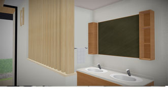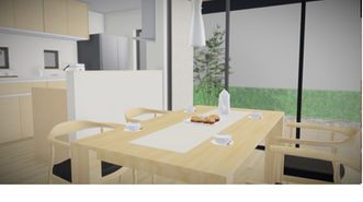 ダイニング脇に庇のかかったおおきなテラスを設けました。天気のいい日は南面のテラスだけでなくこちらでテーブルを出して食事を楽しむこともできます。